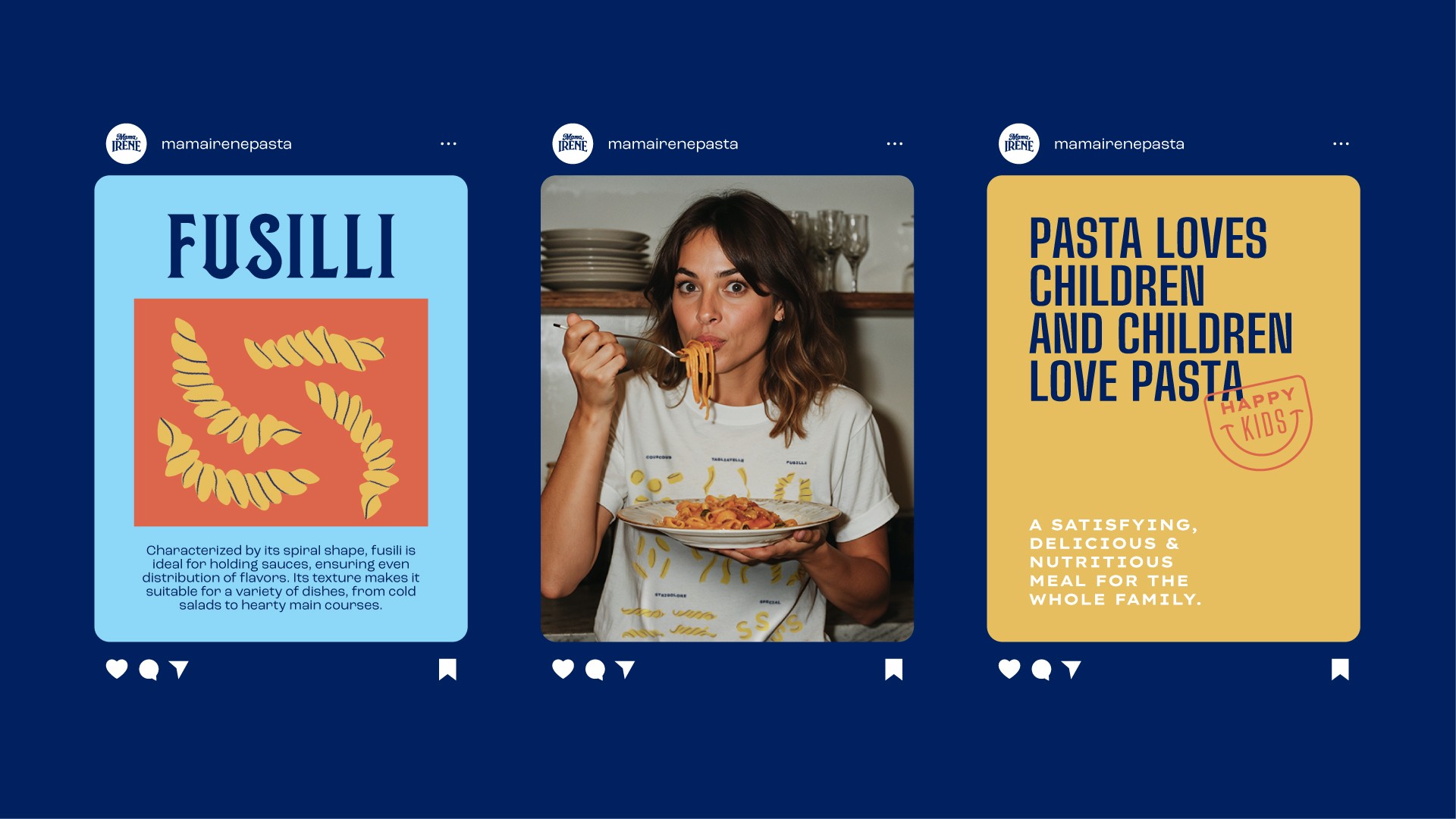 Varumärket och illustrationssystemet är Mama Irenes visuella hjärta. Varje pastasort omvandlas till något levande – något som inbjuder till lek och utforskande. Man kan föreställa sig att glida nedför tagliatelle eller dyka in i en tomatsåspool. Denna lekfulla ton är helt Mama Irene, helt familj, helt grekisk. Det handlar inte om italienska stereotyper – det är ett eget visuellt språk.