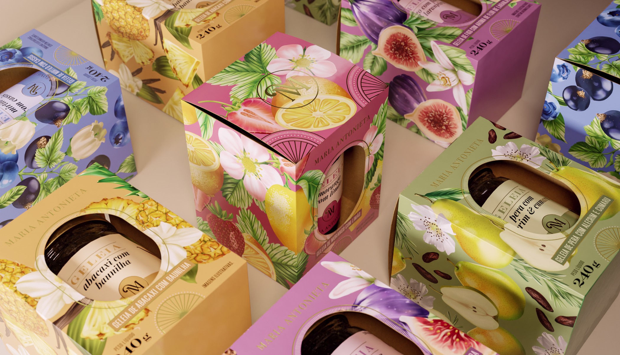 Maria Antonieta är en plats där varje detalj har betydelse. Spetsgardiner. Damastdukar. Porslinstallrikar. En tesked från förra seklet. Denna känsla skulle leva vidare in i marmeladens värld. Vi frågade oss: vad behövs för att förvandla mat till ceremoni? Hot stamping är en gammal teknik som fortfarande kommunicerar lyx. Det är något man känner med fingrarna innan man ser det med ögonen. De realistiska fruktstudierna på lådan är inte fotografier – de är målningar som säger: detta är kvalitet, detta är omsorg, detta är gjort för dig. Färgpaletten är sofistikerad utan att vara mörk. Varje marmelad blev sin egen färghistoria. Jordgubben är inte röd – den är rosé. Aprikosen är inte orange – den är champagne.