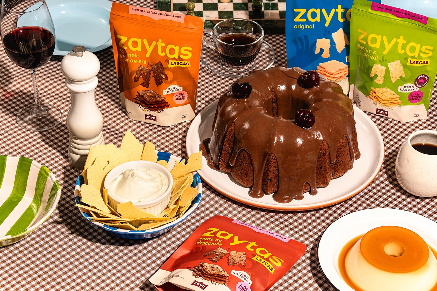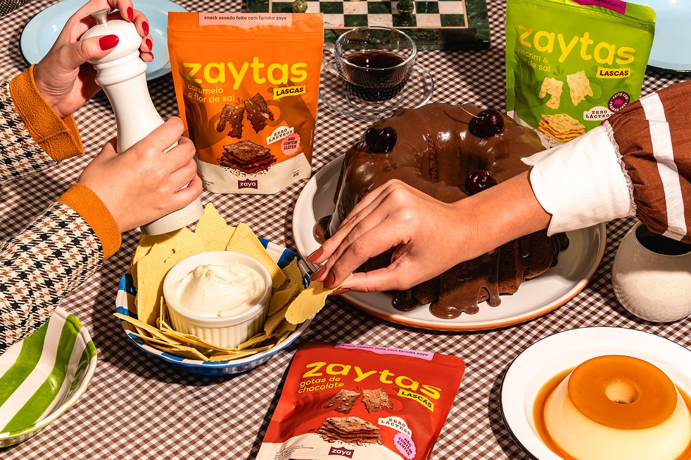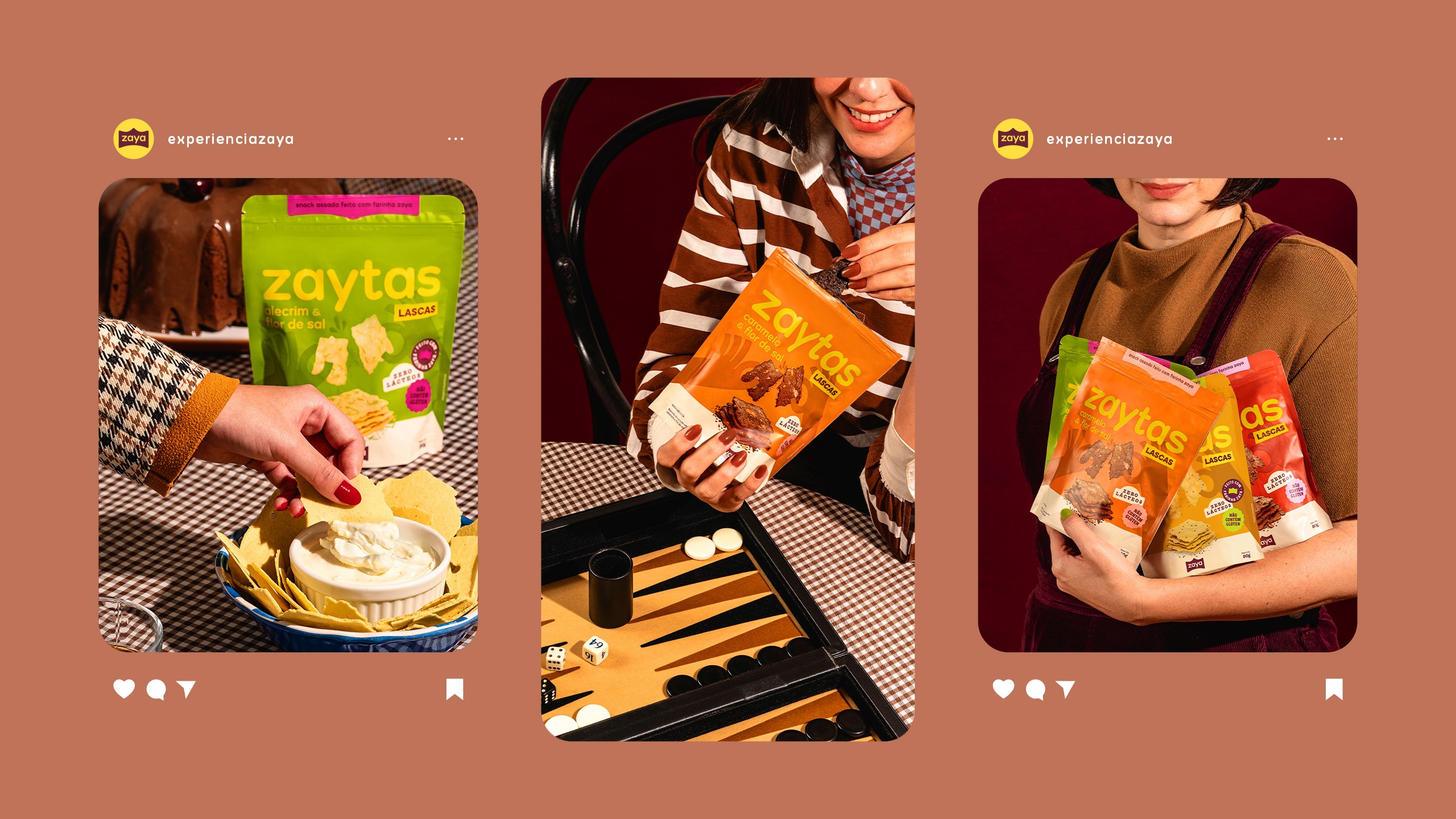 Förpackningarna berättar samma historia. Emblem lyfter produkternas nyckelegenskaper – glutenfritt, mjölkfritt, proteinrikt – utan att skrika. Lekfulla illustrationer för varumärkesvärlden till liv, från mjöl till snacks. Varje smakvariants huvudfärg skiljer den åt, medan sekundärfärger binder ihop linjen visuellt. Och genom allt löper samma budskap: hos Zaya sitter alla vid samma bord, och ingen lämnas utanför.